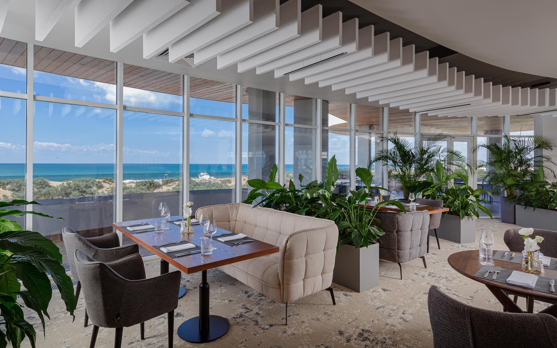 Ресторан расположен в основном здании отеля на 6 этаже. Здесь вас ждёт панорамный вид на Черное море, неповторимые ужины на закате и обеды под бесконечным южным небом.