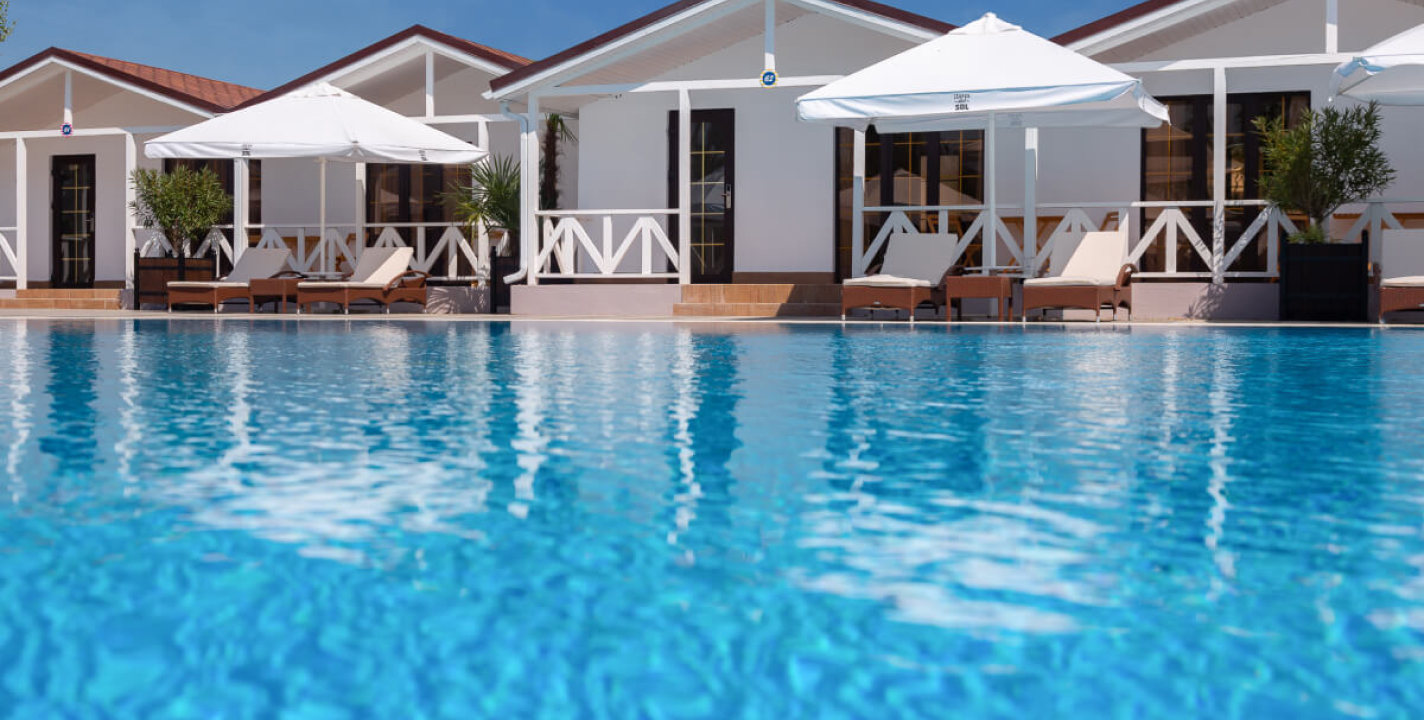 - открытые бассейны с шезлонгами, детской зоной и подводным пляжем.